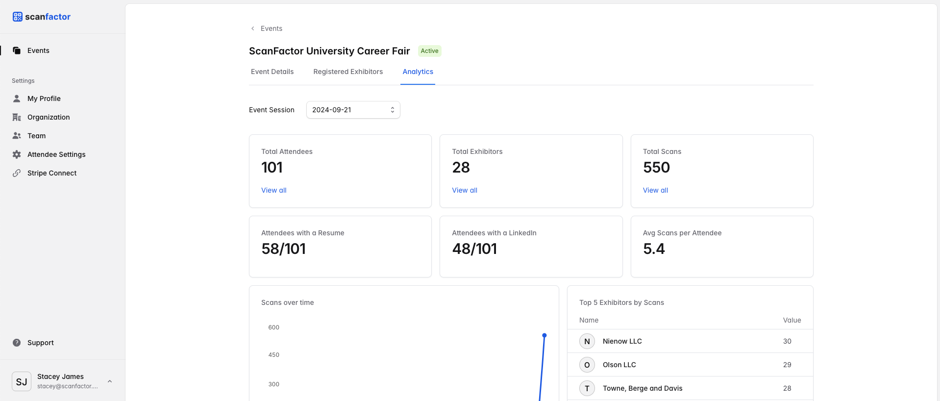 Transform your career fair experience with ScanFactor. Gain unprecedented insights into your events, using our detailed analytics to drive continuous improvement and maximize engagement at every fair.